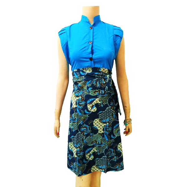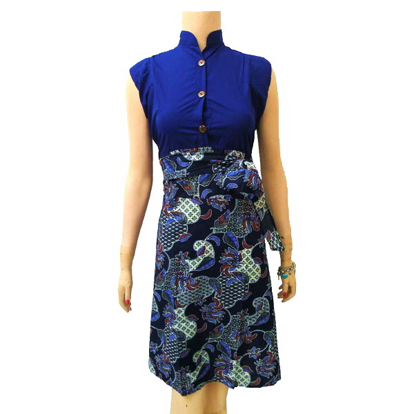 - Dress Batik dengan model Ratu, kerah shanghai, aksen kancing batok, tanpa lengan, sabuk terpisah dan kerut belakang.