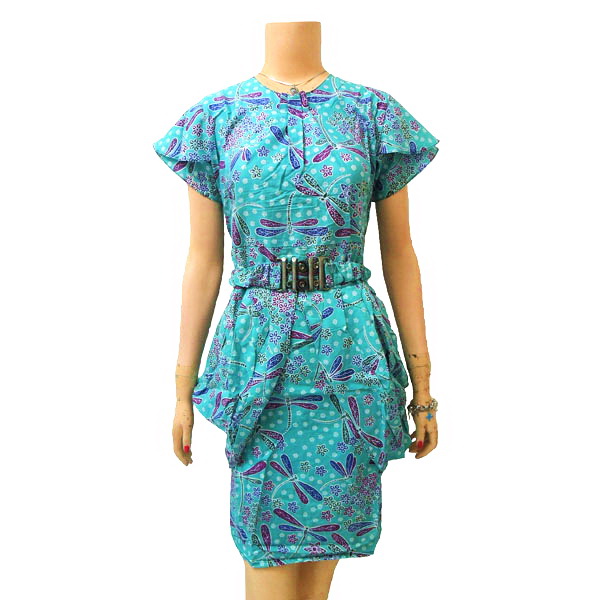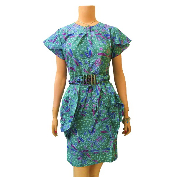 - Dress Batik dengan model tanpa kerah, lengan pendek susun, sabuk terpisah dan kerut belakang.