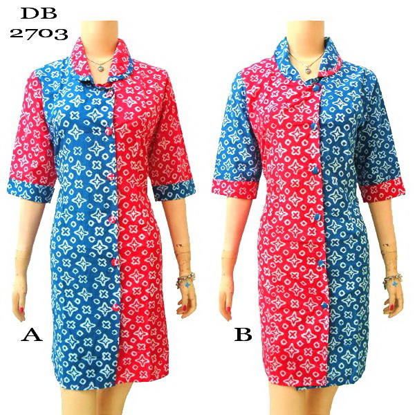 - Dress Batik dengan kerah oval, lengan ¾ (lipat), kancing bungkus, tanpa kerut